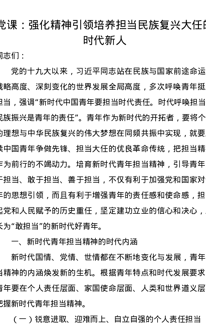 党课讲稿:强化精神引领培养担当民族复兴大任的时代新人