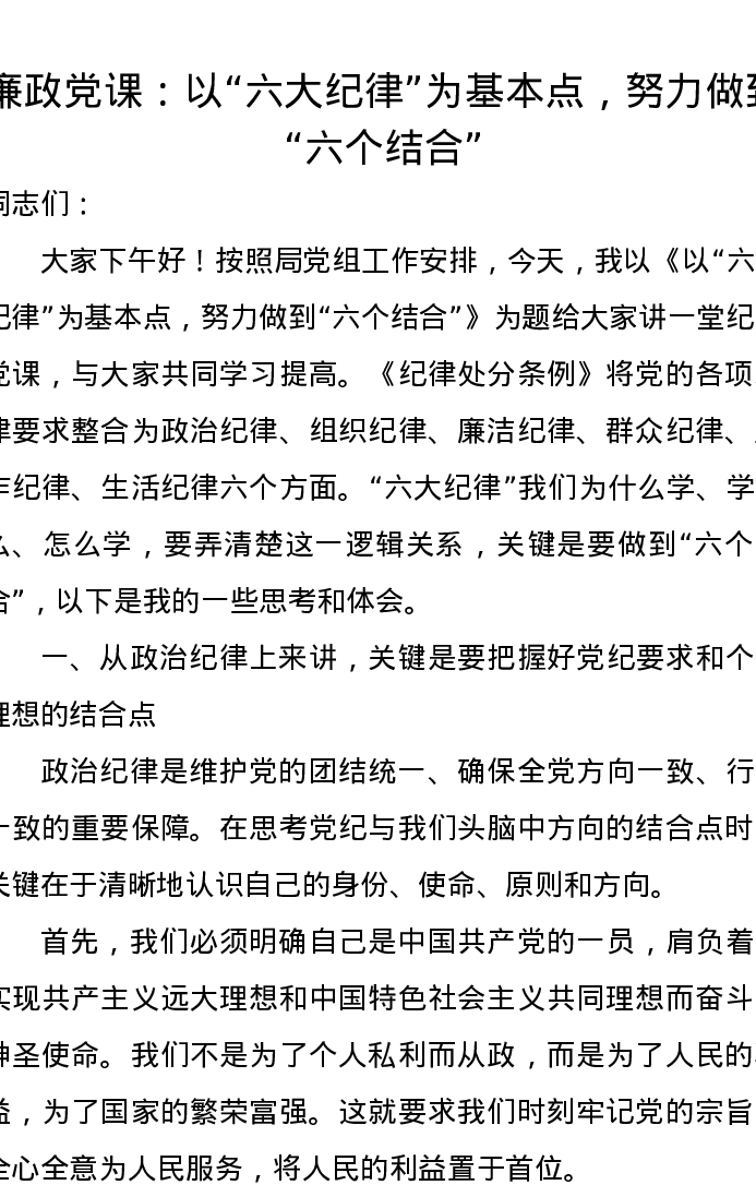 廉政党课:以“六大纪律”为基本点,努力做到“六个结合”