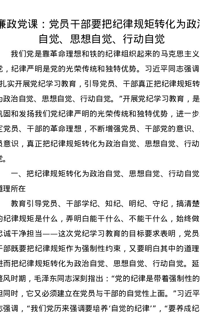 廉政党课讲稿:党员干部要把纪律规矩转化为政治自觉、思想自觉、行动自觉