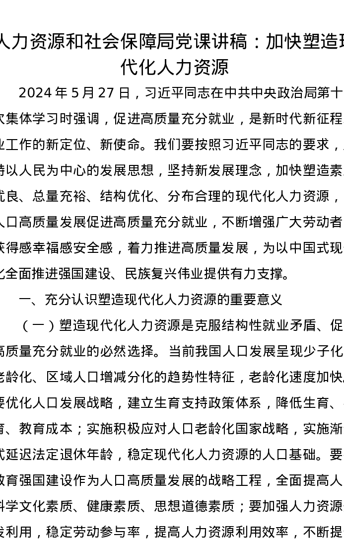 人力资源和社会保障局党课讲稿:加快塑造现代化人力资源