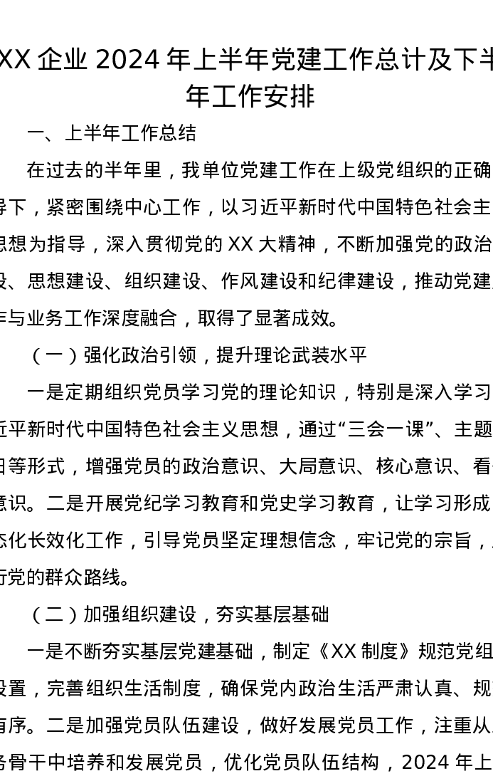 XX企业2024年上半年党建工作总计及下半年工作安排