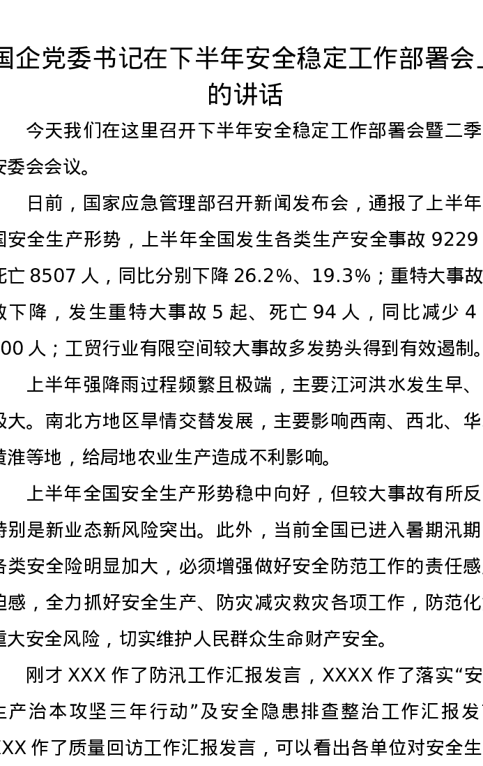 国企党委书记在下半年安全稳定工作部署会上的讲话