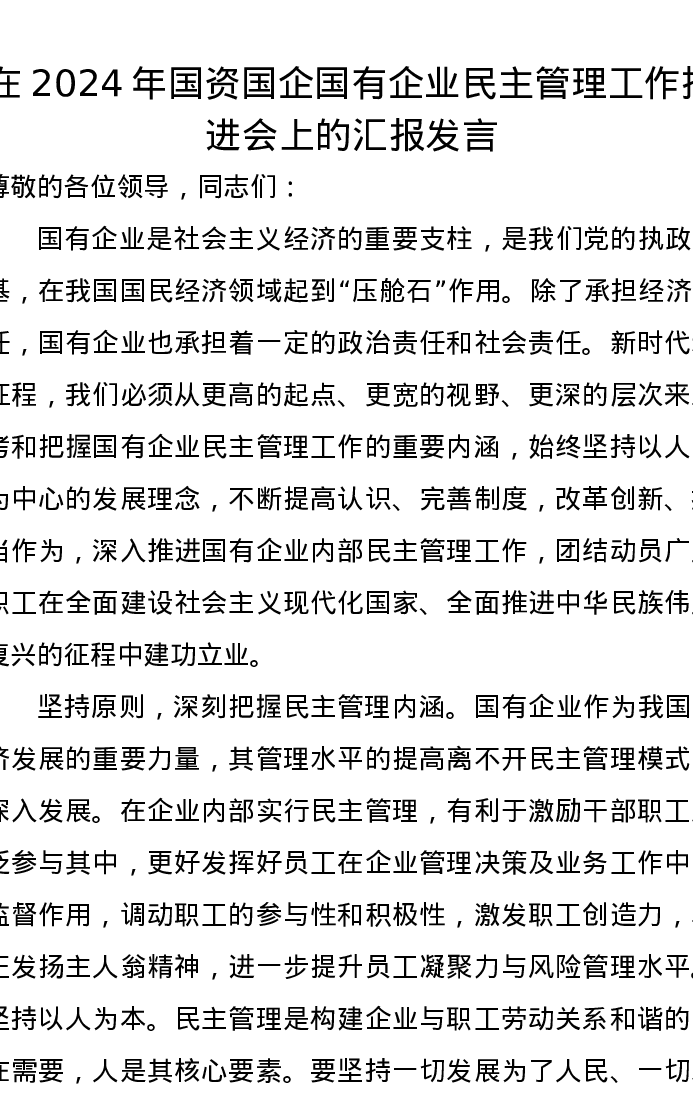在2024年国资国企国有企业民主管理工作推进会上的汇报发言