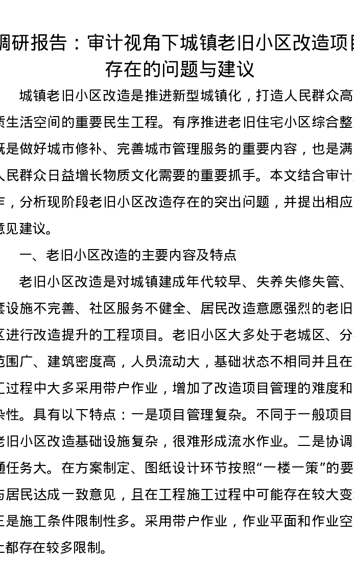 调研报告:审计视角下城镇老旧小区改造项目存在的问题与建议