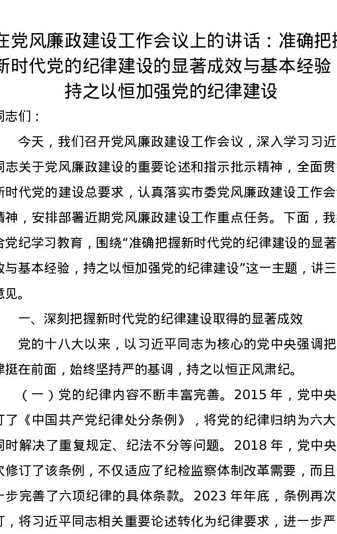 在党风廉政建设工作会议上的讲话:准确把握新时代党的纪律建设的显著成效与基本经验,持之以恒加强党的纪律建设