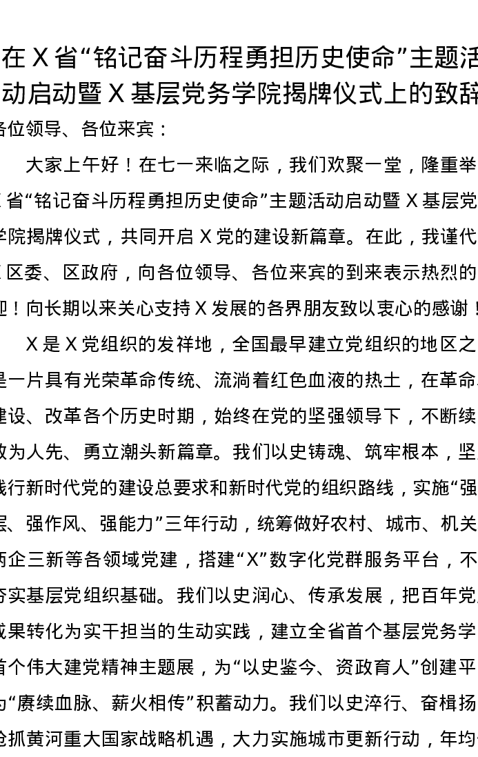 在X省“铭记奋斗历程勇担历史使命”主题活动启动暨X基层党务学院揭牌仪式上的致辞
