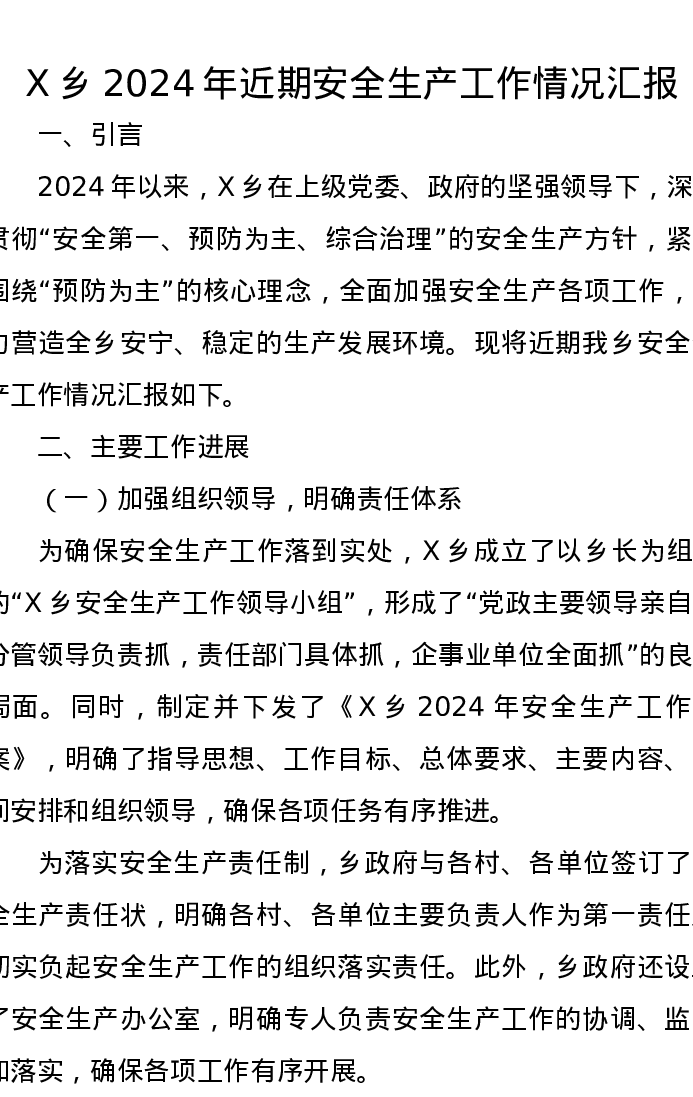 X乡2024年近期安全生产工作情况汇报
