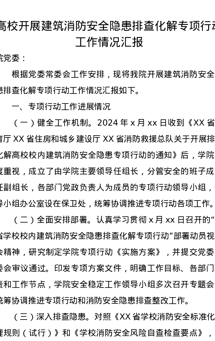 高校开展建筑消防安全隐患排查化解专项行动工作情况汇报