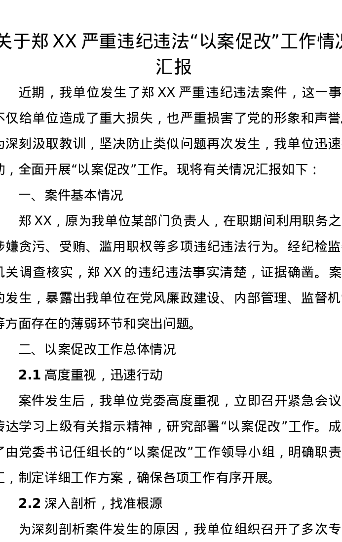 关于郑XX严重违纪违法“以案促改”工作情况汇报