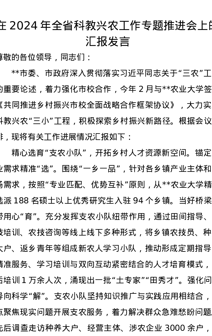 在2024年全省科教兴农工作专题推进会上的汇报发言