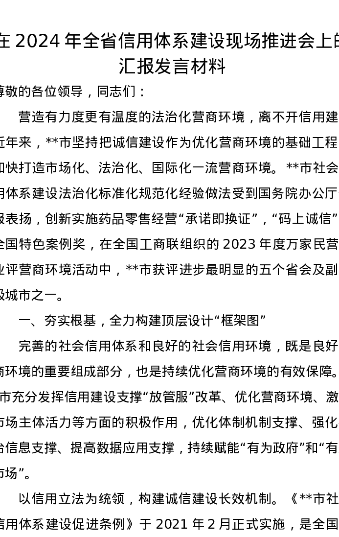 在2024年全省信用体系建设现场推进会上的汇报发言材料