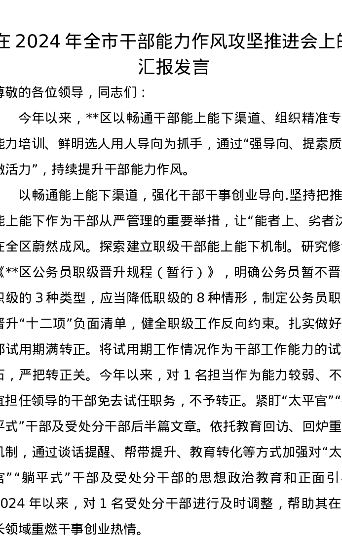 在2024年全市干部能力作风攻坚推进会上的汇报发言