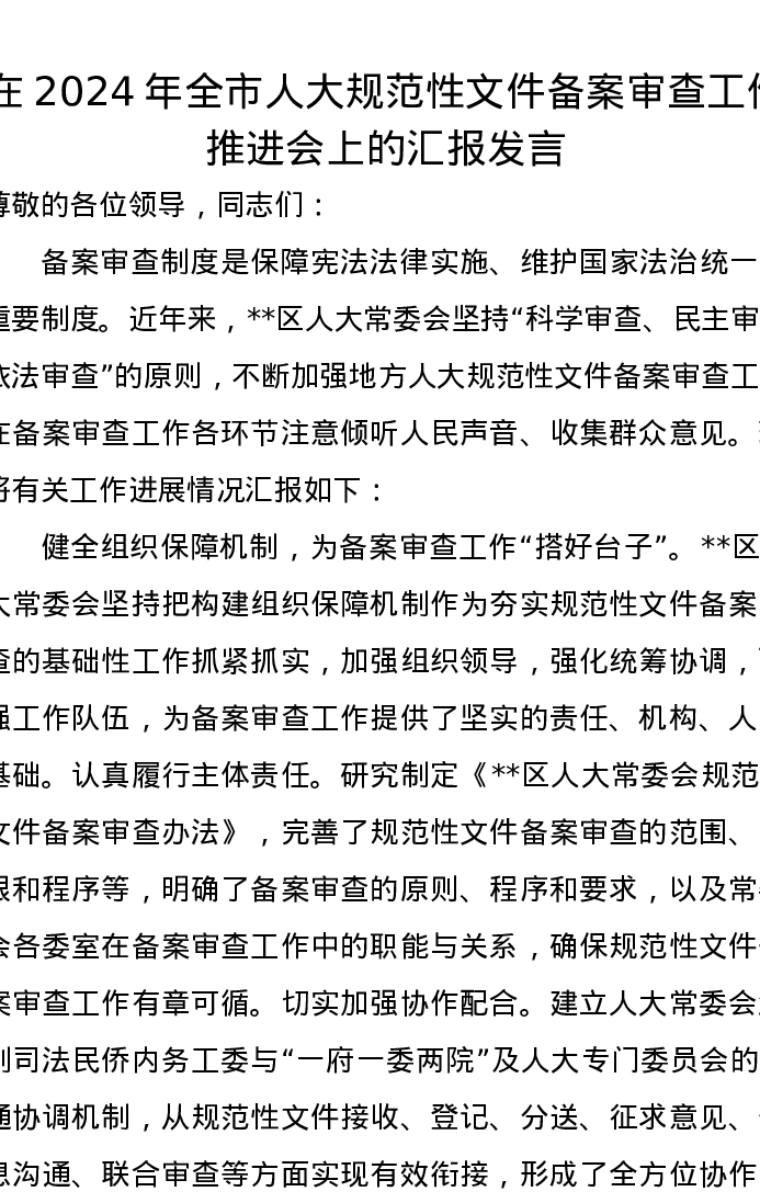 在2024年全市人大规范性文件备案审查工作推进会上的汇报发言