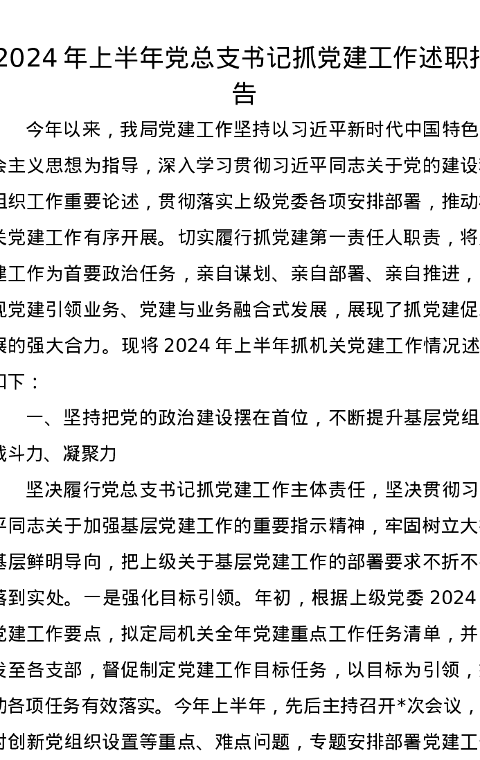 2024年上半年党总支书记抓党建工作述职报告