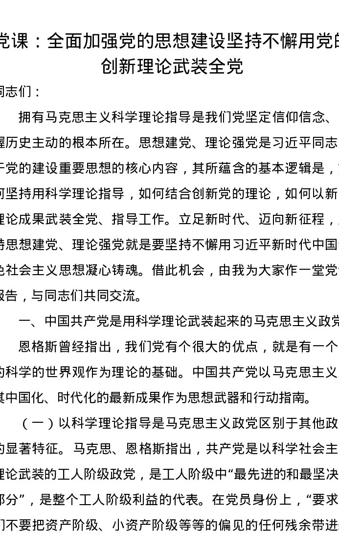 党课:全面加强党的思想建设坚持不懈用党的创新理论武装全党