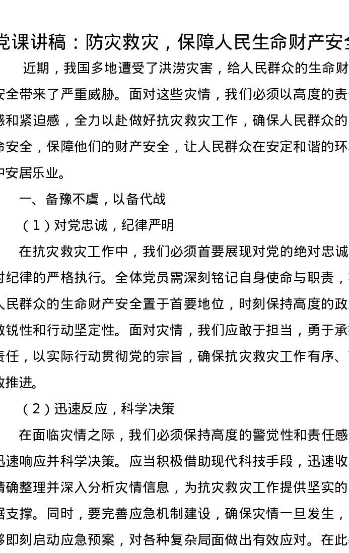 党课讲稿:防灾救灾,保障人民生命财产安全