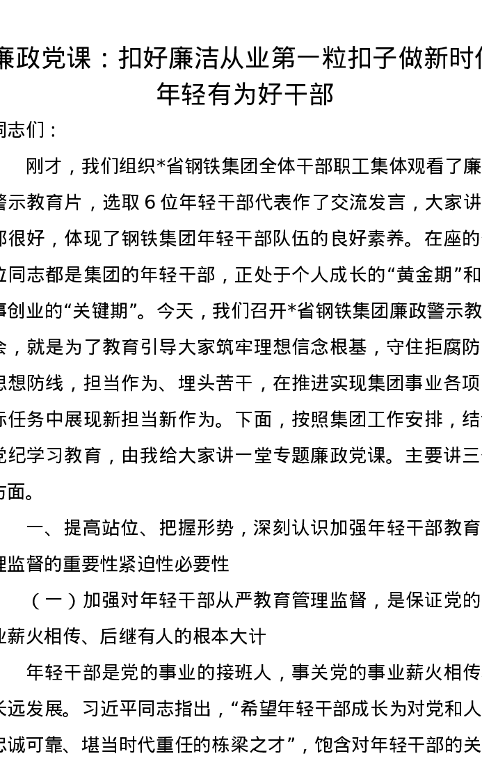 廉政党课讲稿:扣好廉洁从业第一粒扣子做新时代年轻有为好干部