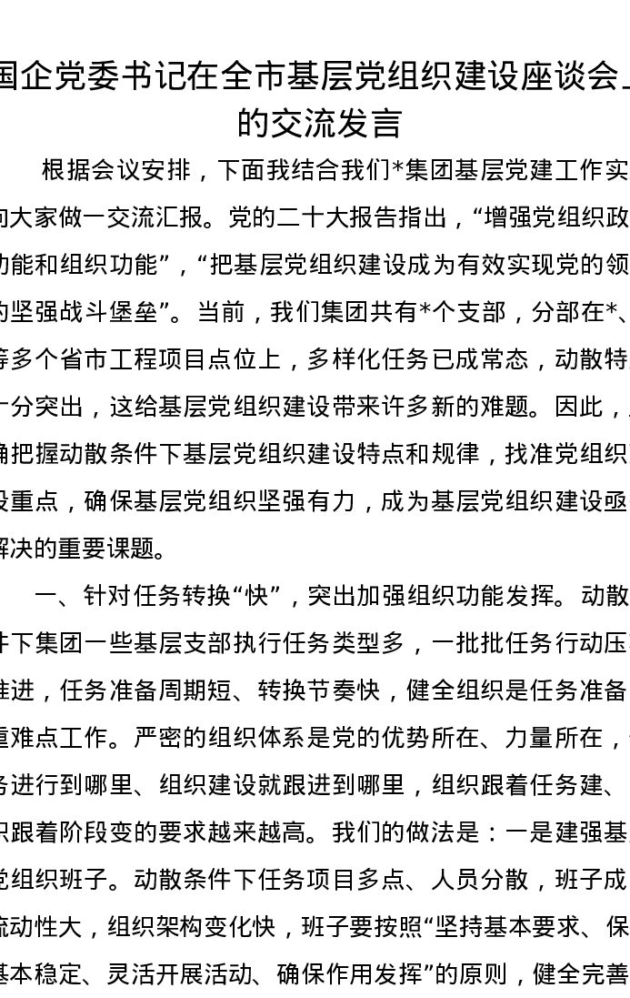 国企党委书记在全市基层党组织建设座谈会上的交流发言