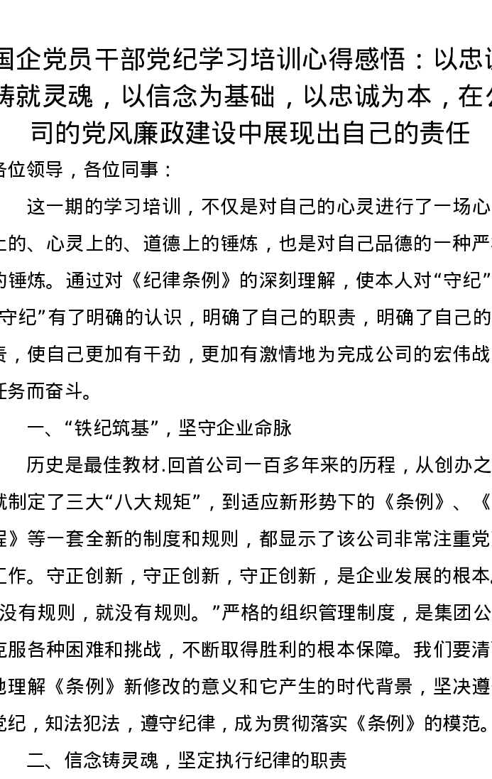 国企党员干部党纪学习培训心得感悟:以忠诚铸就灵魂,以信念为基础,以忠诚为本,在公司的党风廉政建设中展现出自己的责任