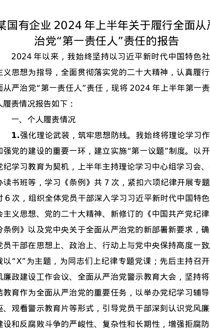 某国有企业2024年上半年关于履行全面从严治党“第一责任人”责任的报告