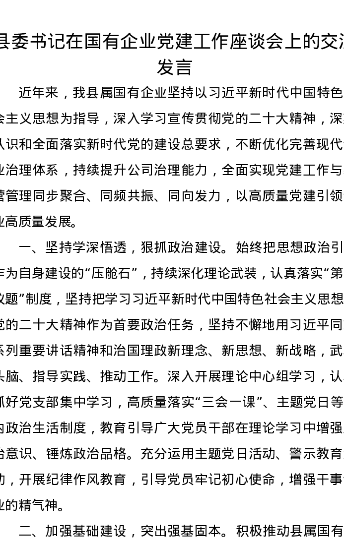 县委书记在国有企业党建工作座谈会上的交流发言
