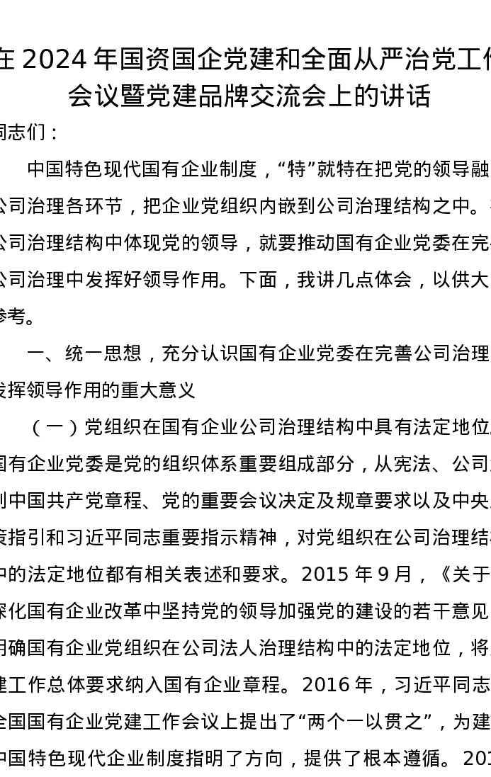 在2024年国资国企党建和全面从严治党工作会议暨党建品牌交流会上的讲话