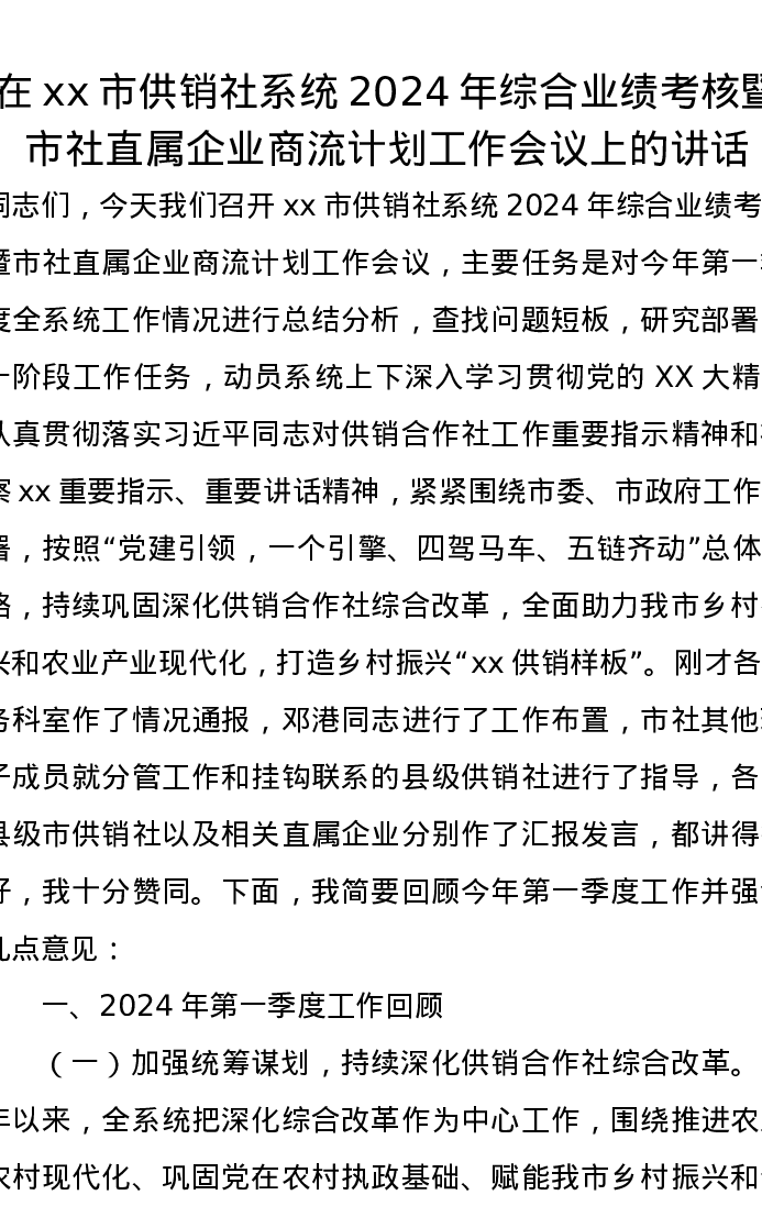 在xx市供销社系统2024年综合业绩考核暨市社直属企业商流计划工作会议上的讲话