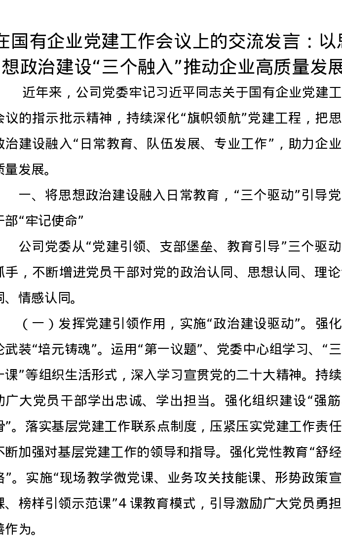 在国有企业党建工作会议上的交流发言:以思想政治建设“三个融入”推动企业高质量发展