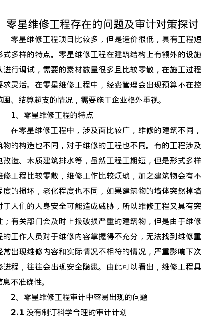 调研报告:零星维修工程存在的问题及审计对策探讨