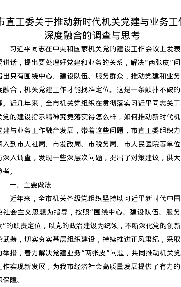 调研报告:市直工委关于推动新时代机关党建与业务工作深度融合的调查与思考