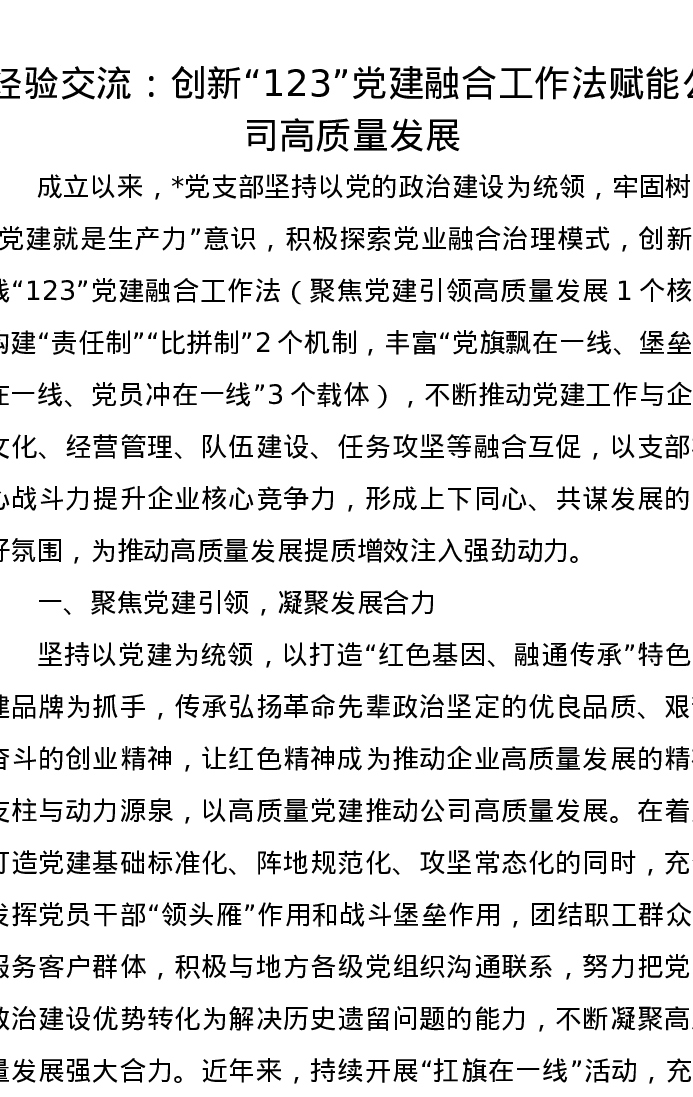 经验交流:创新“123”党建融合工作法赋能公司高质量发展