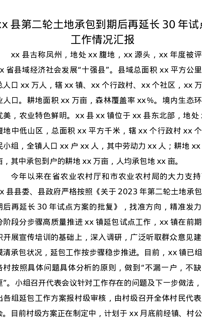 xx县第二轮土地承包到期后再延长30年试点工作情况汇报