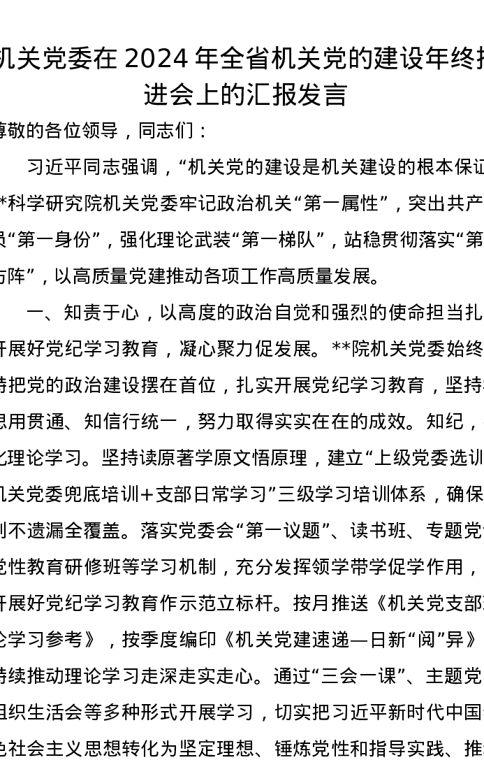 机关党委在2024年全省机关党的建设年终推进会上的汇报发言