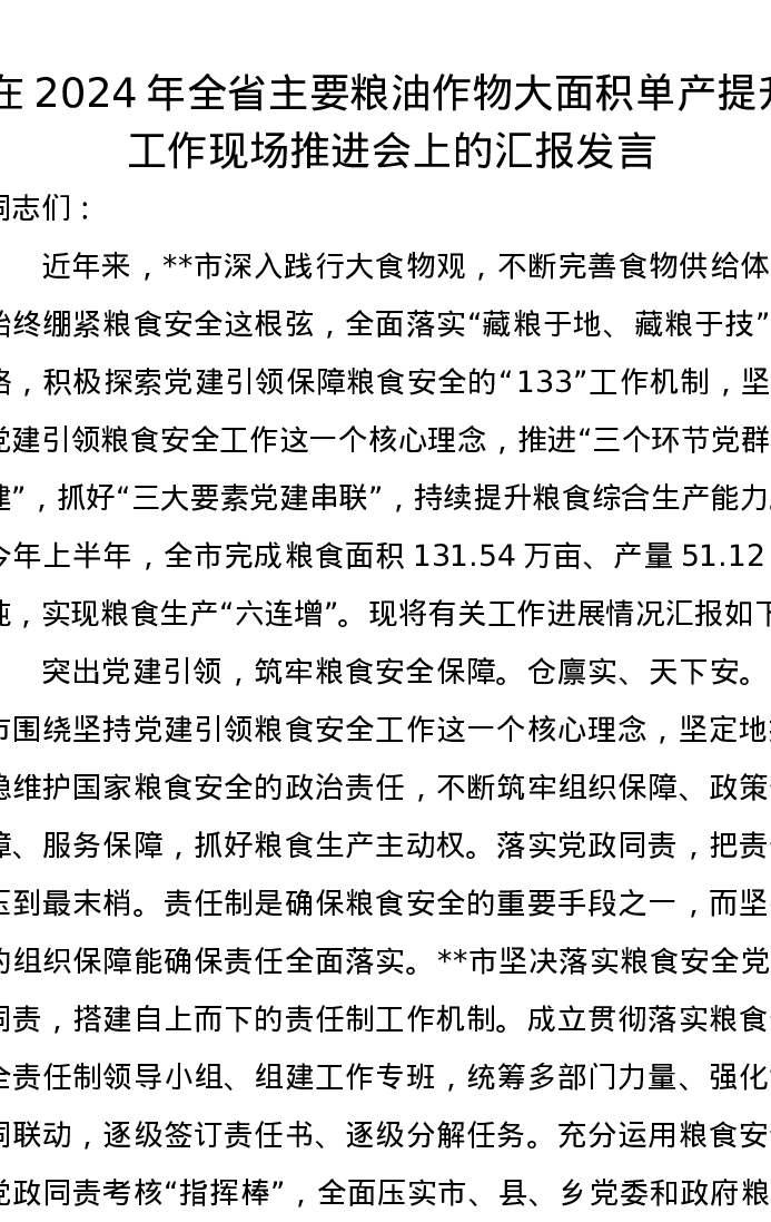 在2024年全省主要粮油作物大面积单产提升工作现场推进会上的汇报发言