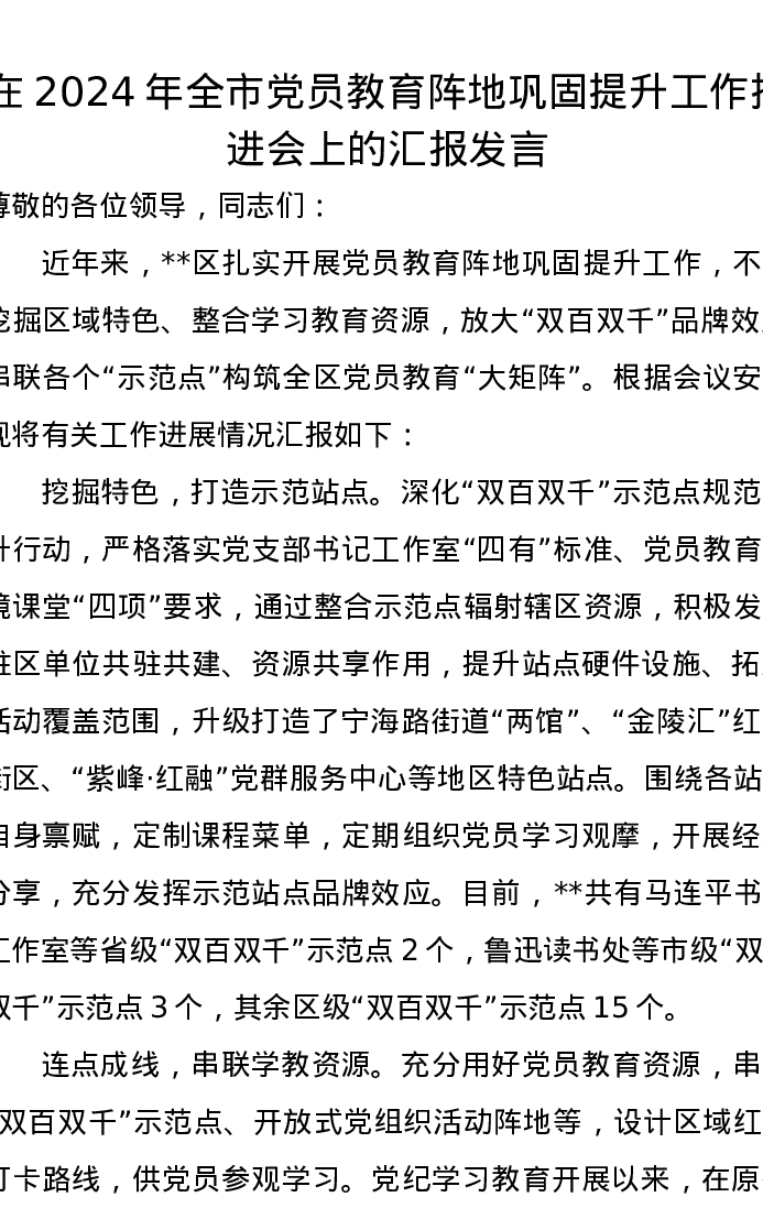 在2024年全市党员教育阵地巩固提升工作推进会上的汇报发言
