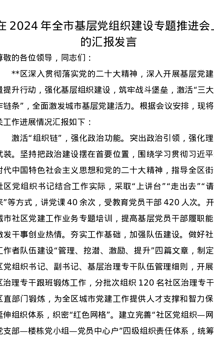 在2024年全市基层党组织建设专题推进会上的汇报发言