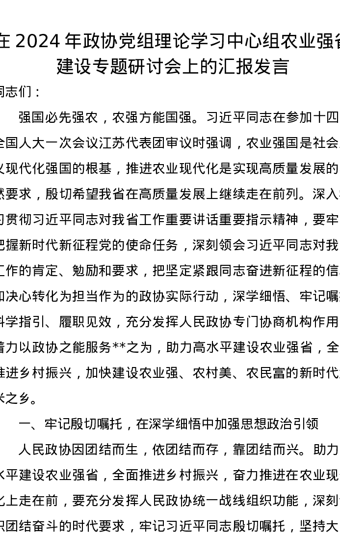 在2024年政协党组理论学习中心组农业强省建设专题研讨会上的汇报发言