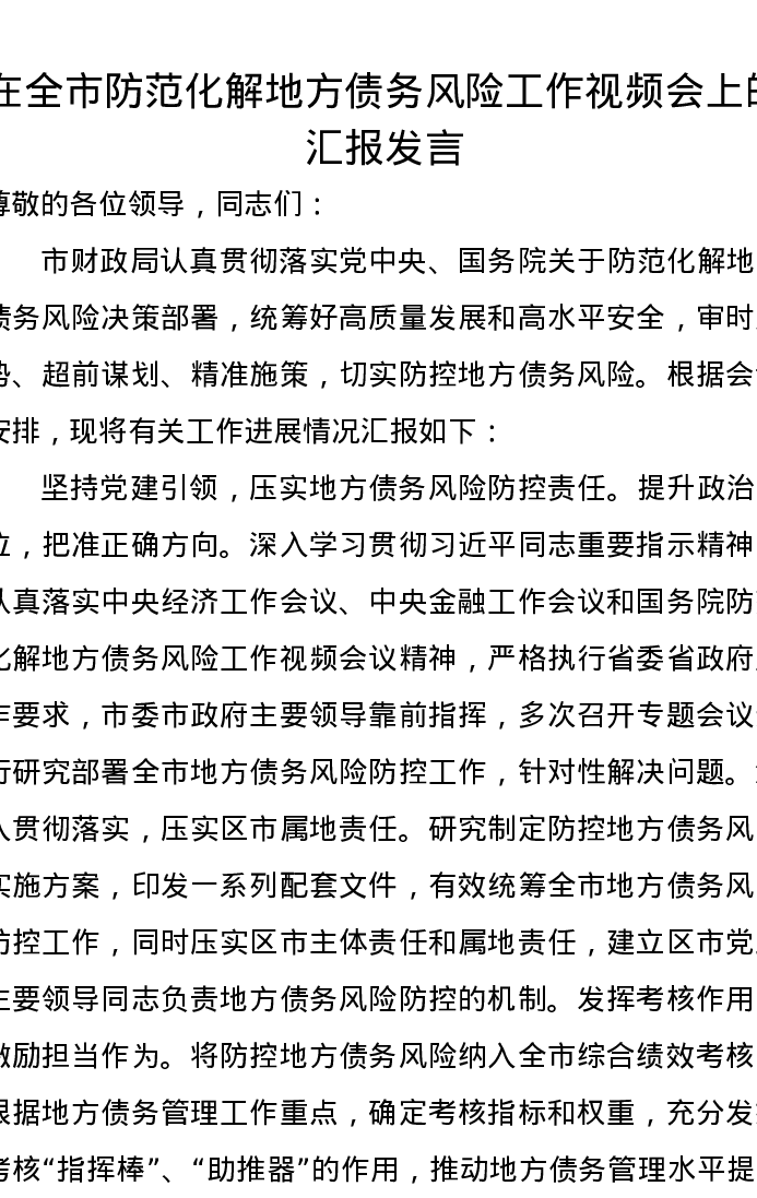 在全市防范化解地方债务风险工作视频会上的汇报发言
