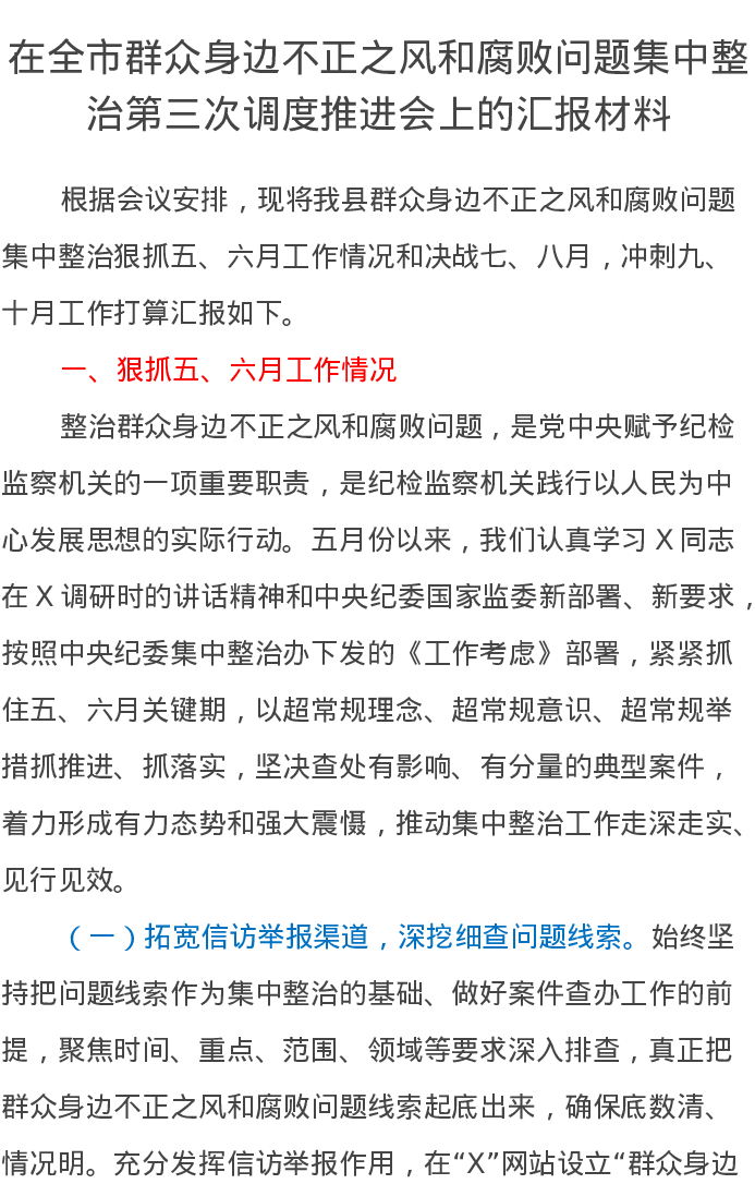 在全市群众身边不正之风和腐败问题集中整治第三次调度推进会上的汇报材料