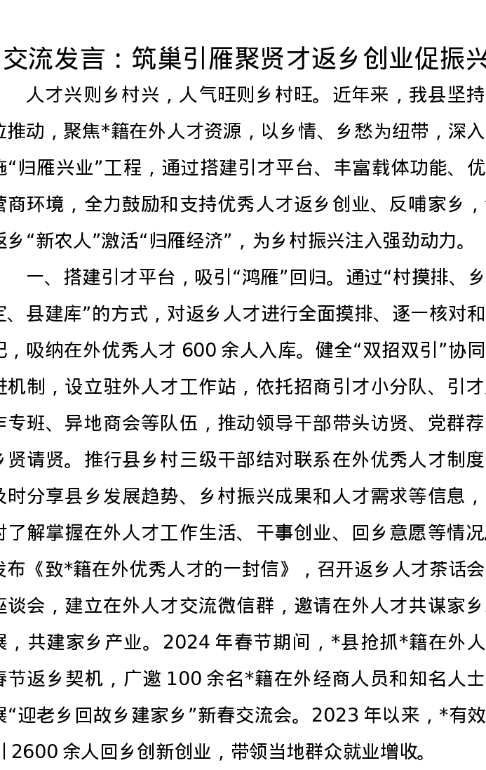 交流发言:筑巢引雁聚贤才返乡创业促振兴