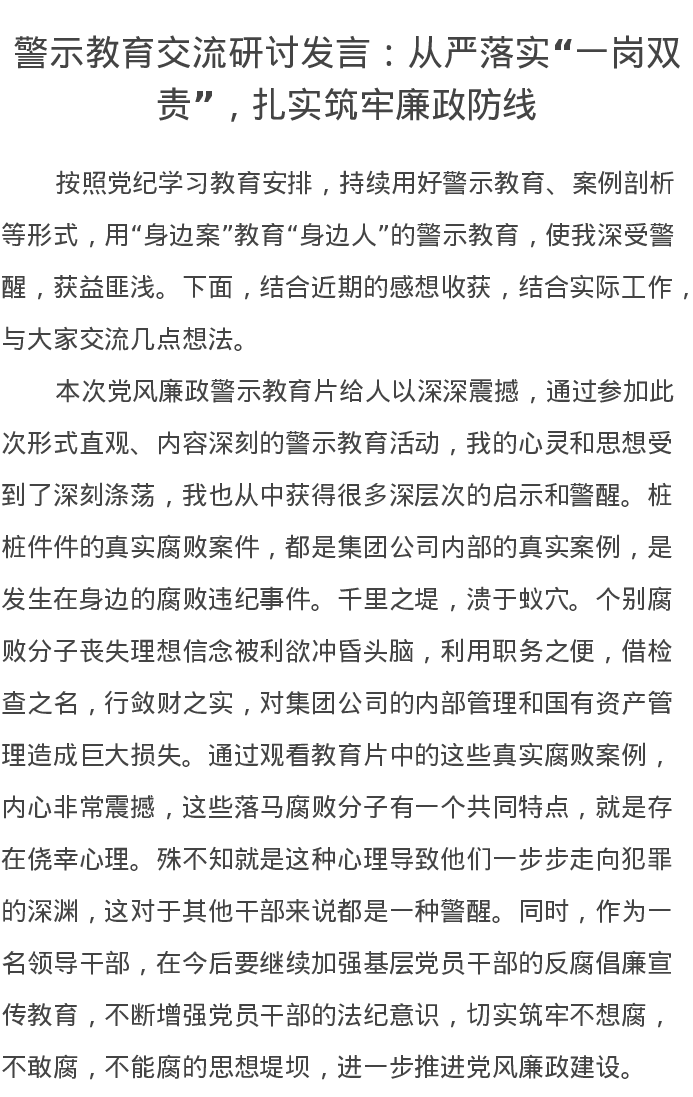 警示教育交流研讨发言:从严落实“一岗双责”,扎实筑牢廉政防线