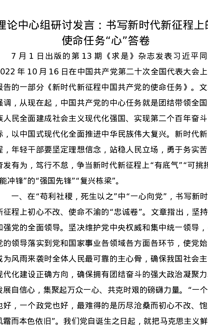 理论中心组研讨发言:书写新时代新征程上的使命任务“心”答卷