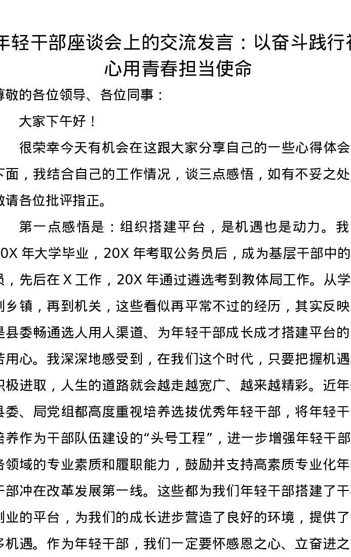 年轻干部座谈会上的交流发言:以奋斗践行初心用青春担当使命