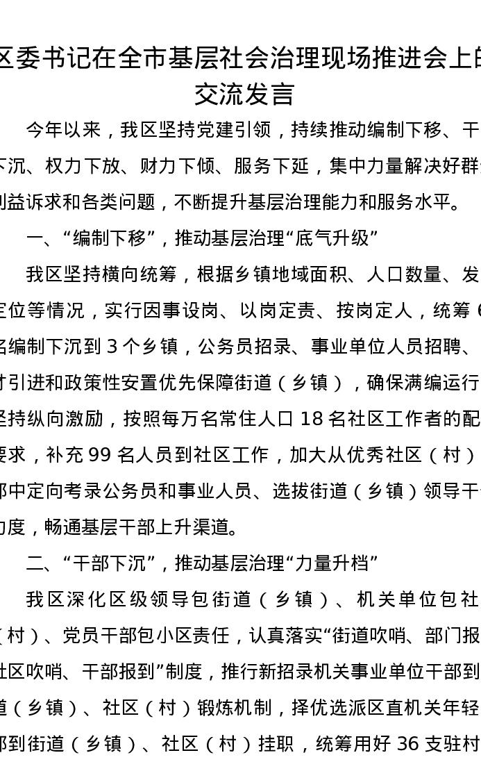 区委书记在全市基层社会治理现场推进会上的交流发言
