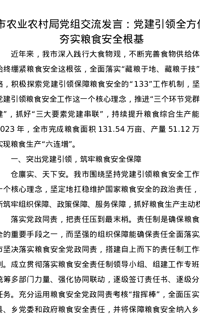 市农业农村局党组交流发言:党建引领全方位夯实粮食安全根基