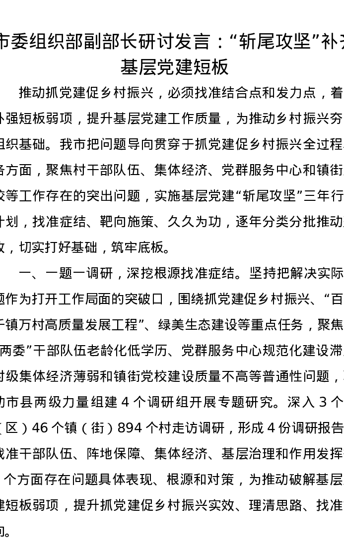 市委组织部副部长研讨发言:“斩尾攻坚”补齐基层党建短板