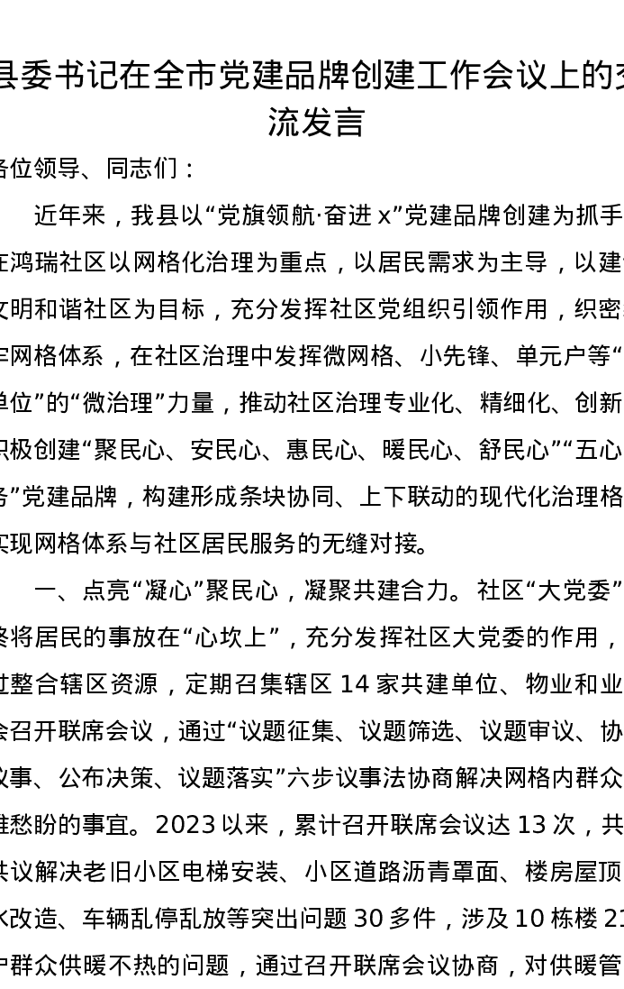 县委书记在全市党建品牌创建工作会议上的交流发言