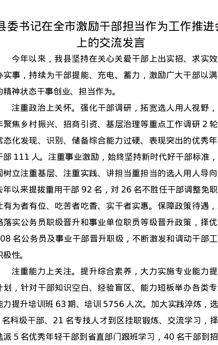 县委书记在全市激励干部担当作为工作推进会上的交流发言