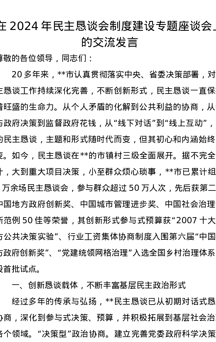 在2024年民主恳谈会制度建设专题座谈会上的交流发言