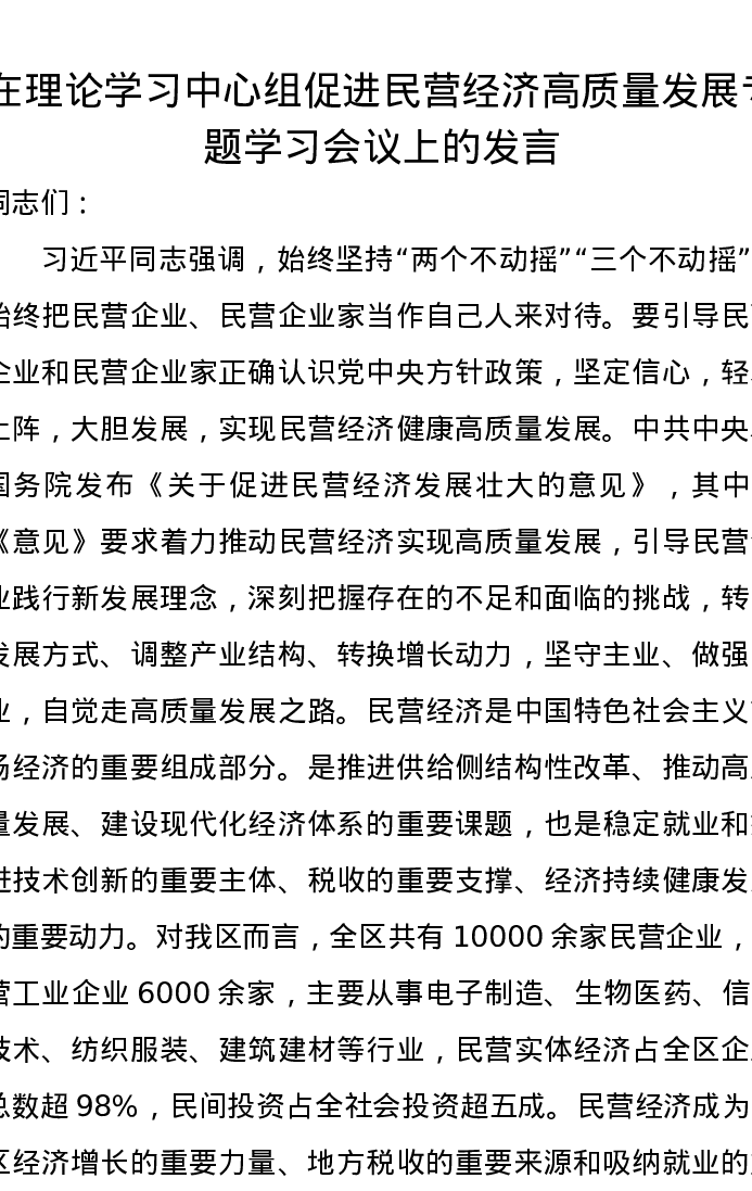 在理论学习中心组促进民营经济高质量发展专题学习会议上的发言
